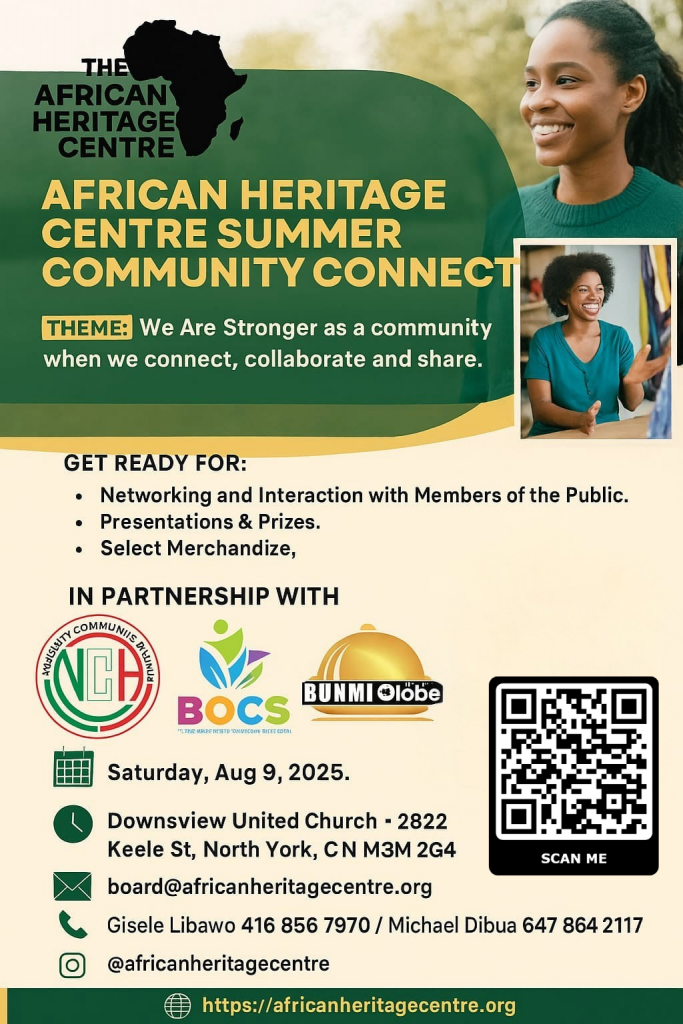 On Saturday, August 9, 2025, the African Heritage Centre invites you to an unforgettable celebration of community, culture, and connection at the Summer Community Connect event, hosted at Downsview United Church, 2822 Keele Street, North York, ON. From 1:00 PM to 6:00 PM, this vibrant gathering promises to be more than just […]
